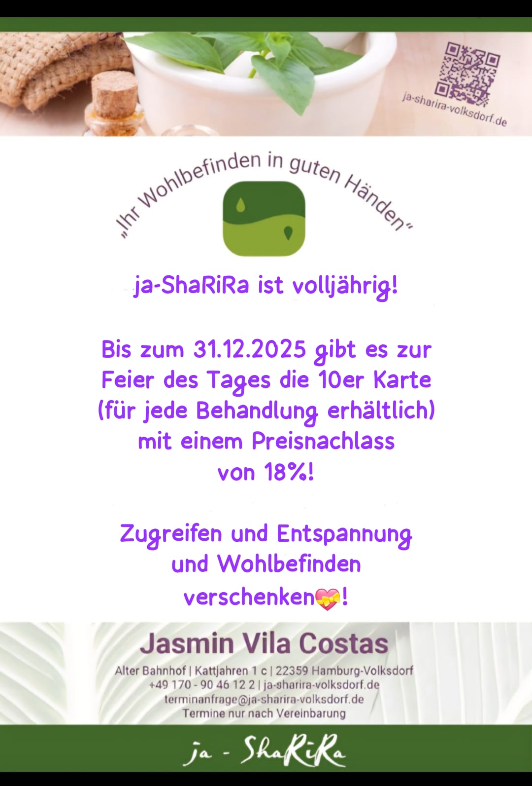 Immer ein Besuch wert! Ich war in beiden Schwangerschaften zur Schwangern-Massage bei Jasmin Vila Costas und auch jetzt immer wieder gern, denn ein Besuch bei Ihr ist immer ein kleiner Kurzurlaub für Körper und Seele.
